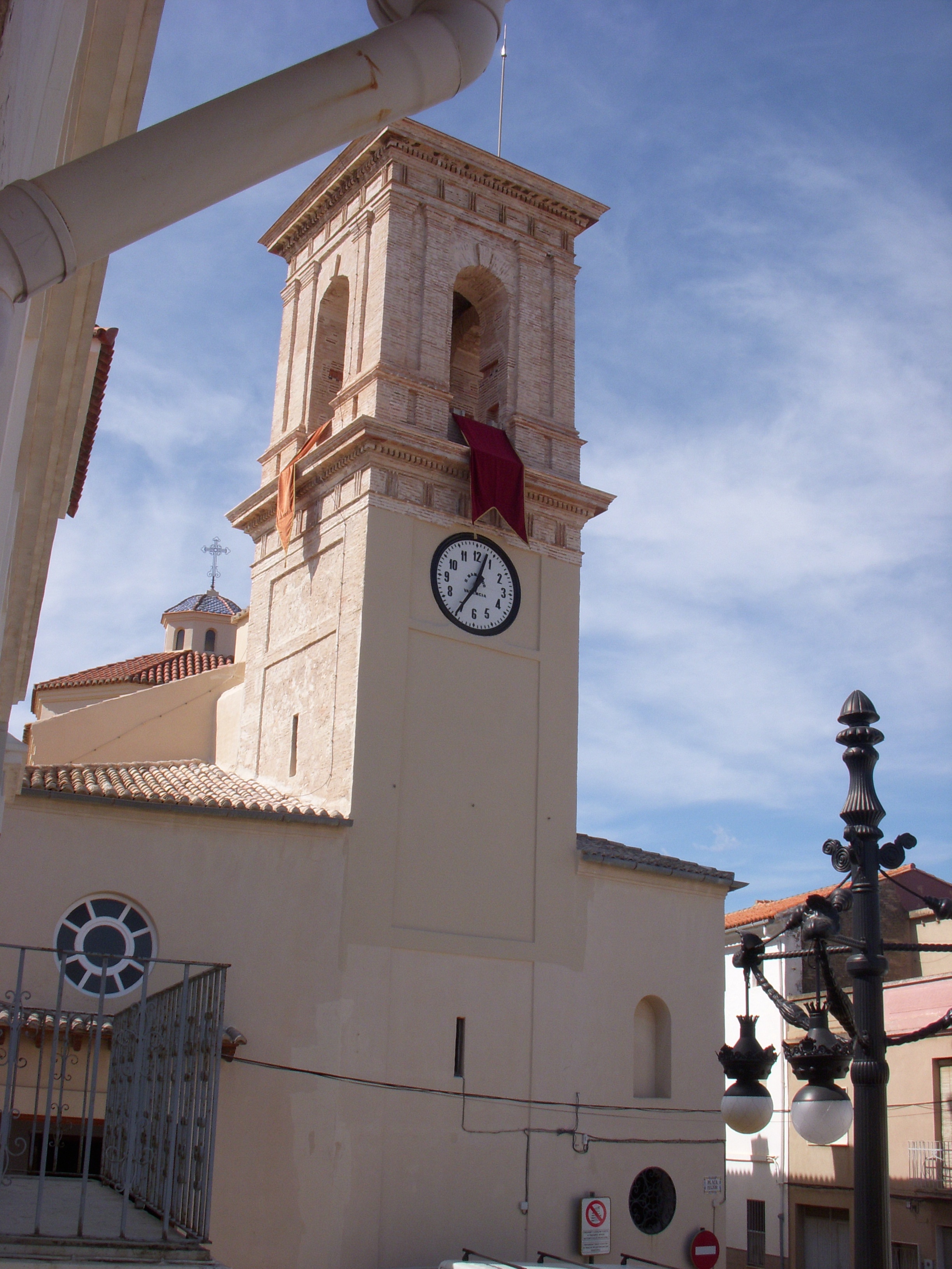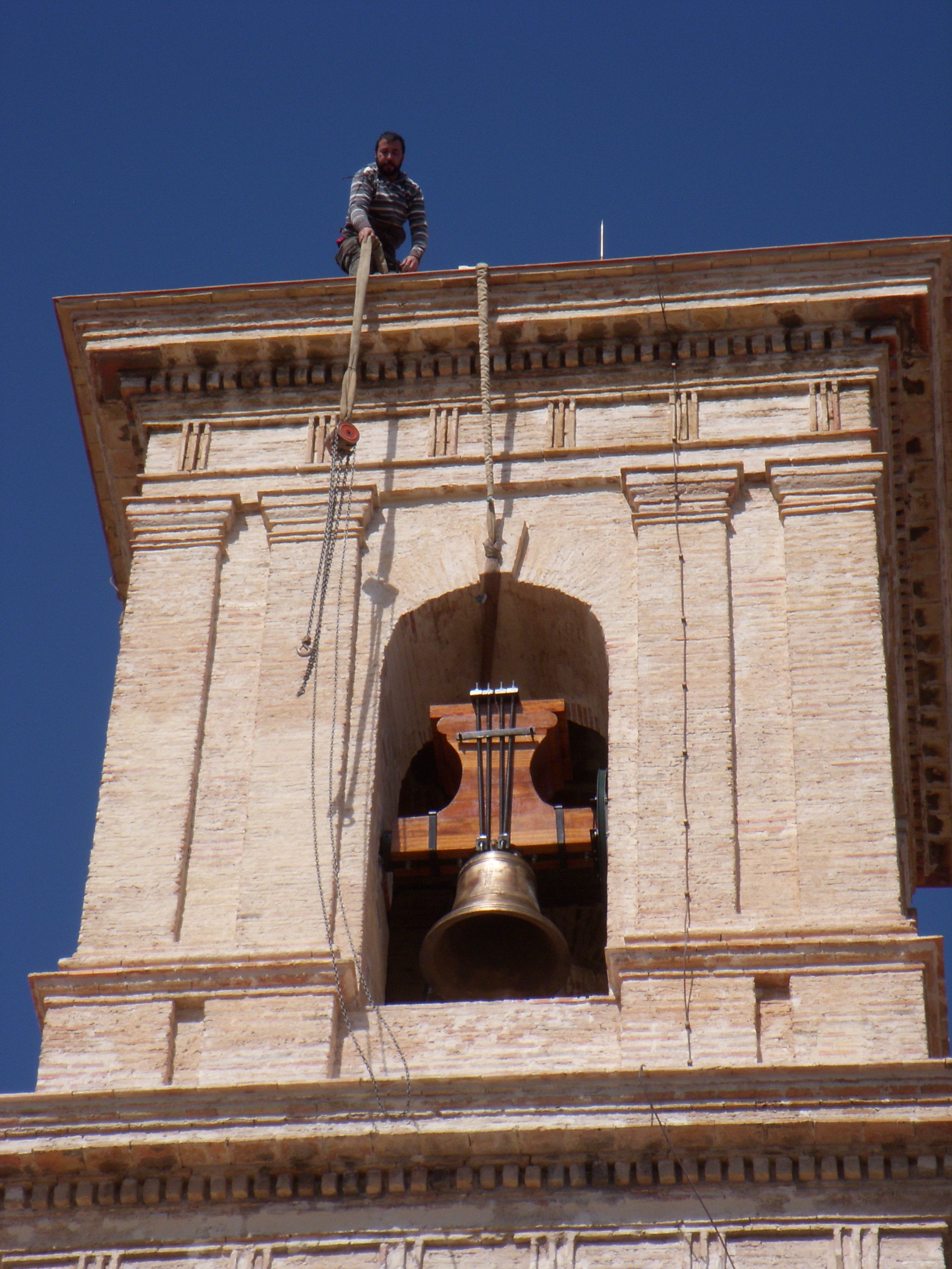 Now at this point dear reader , you may be thinking – the area has been cleared, there is a police cordon ………no, this is Spain, and I quote from our friend “ There was a big ceremony, with a speech from the Mayor, the Town band playing and a demonstration of the bells while still on the ground – very loud, and then we all stood in the square just a few metres from the crane as it lifted them up to the top of the tower. I stood well back but the schools kids were sat very close!!!! Can you see the man hanging over the edge at the top of the tower in the picture? Elf & Safety – what?”