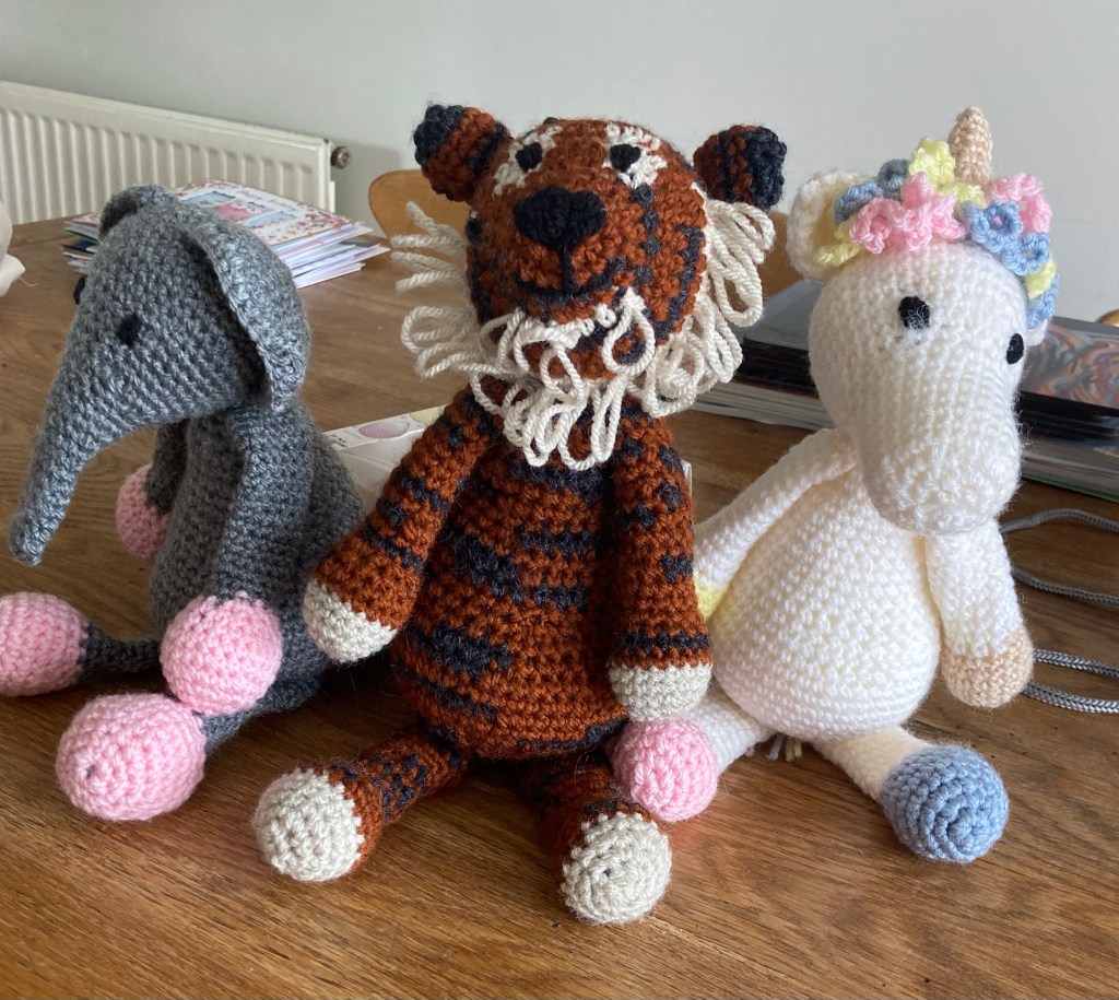Certainly my creative writing left me during Covid but it didn’t mean I was inactive or bored – part of my routine was baking cakes for those neighbours working under difficult circumstances ie in the NHS or in schools and I also started to crochet ! Not blankets or anything thing straightforward- not I . Jump straight in at the deep end and crochet animals ! My very good friend ( and neighbour as it happens) had started this hobby and persuaded me to start, and so I did – and what a challenge ! I asked friends and family what their children’s (and of those, 7 were my grandchildren) favourite animal was! Well if I’d hoped for a dog or a cat ( simple things to make) – I certainly didn’t get them ! A giraffe, a wolf, a unicorn, a dinosaur …….. as I said just jump in the deep end- take a risk- that’s how I learnt !