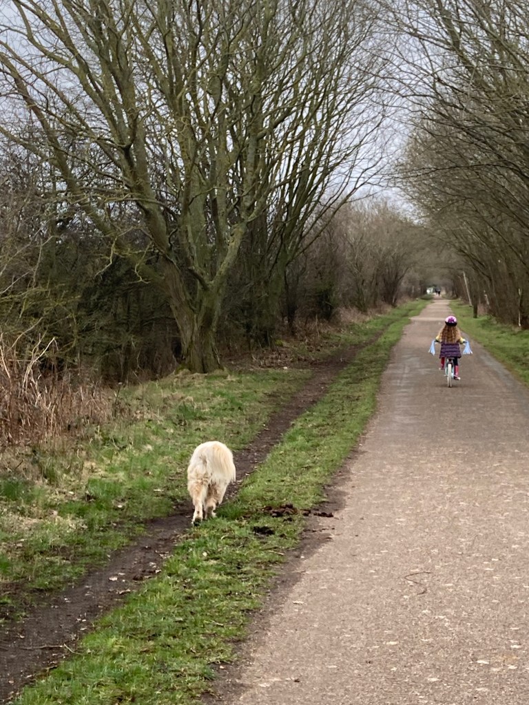 Now today’s walk was carefully planned as we were going to watch Ross ( number 2 in our 4 children) play tag rugby for the Yorkshire Roses over 40’s team at 1 pm – but you know too well about the best made plans of mice and men…..indeed they went wayward because to my delight, our granddaughter came to stay ! So I was faced with a dilemma. What to do re my Saturday walk? (bearing in mind we were all going to go to watch the rugby) Millie needed a walk before we left ; I needed to complete my 5 km ( if I hadn’t done so before I have to walk the best part of 15 times round a rugby pitch) hence hands full ! …….solution , take granddaughter plus bicycle, plus dog and yours truly , drive to trans Penine trail ( ok we live within walking distance of said trail but give me some slack , surely you agree it is too much for me to walk up a hill with dog plus granddaughter plus bicycle ….) and bob’s your uncle ( trust me…)