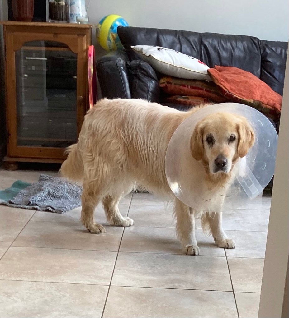 Mum and girls then reappeared , all three heartbroken, though Mum holding it together… the bill is paid and then they leave without their beloved pet. By this time surgery has filled with people who’ve finished work ….no sign of Mr Davis’ bundle … then “ Millie’s Mum please” Phew off I go …all has gone well but I am warned that eyelids have an excellent blood supply so there may be a bit of leakage but not to worry – they wanted to see her again in three days time ! The nurse is dispatched to retrieve my precious pet ….”oh, do you want a collar” …. “Yes please- I don’t want a blood bath with her scratching her eye..” and with that we’re out of the door….to the car collar in place.