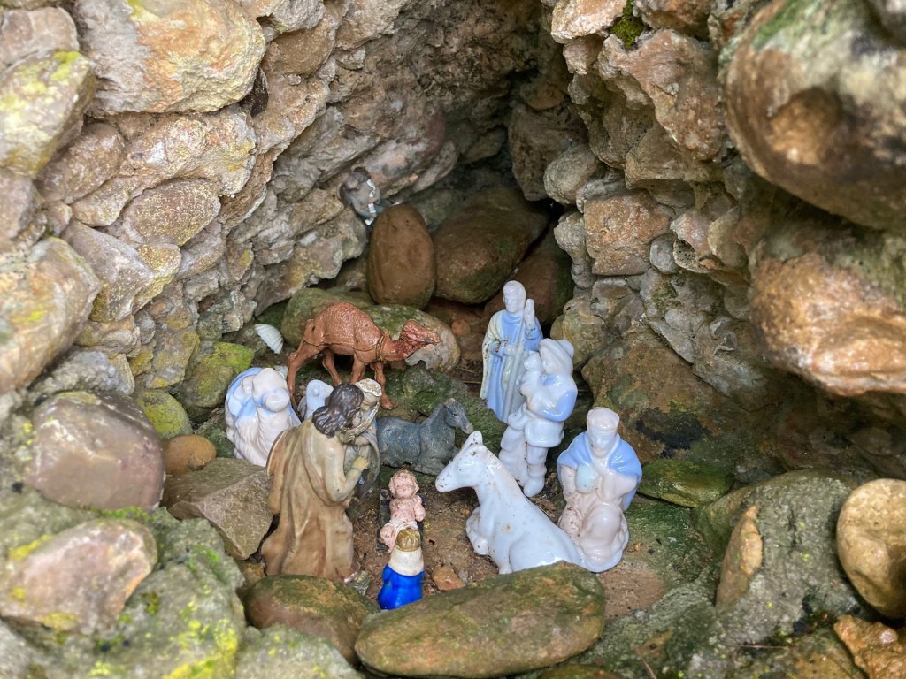 Now you can imagine what we assumed ( wrongly of course 🙈🙈) clearly he’d been caught short ( but hardly out of view !)…really, some people …STOP right there . He spoke to us in Spanish to tell us there was a hidden Nativity Scene in the wall ….pull the other leg, I thought , it’s got bells on … but no, clearly he wanted to show us this “ Nativity Scene” Well, I stepped up onto the banking , and he put his hands on my buttocks and pushed . Woosh …I was up in a jiffy ( at this point Kathleen had leapt up , no need for a heave ho for her!! ) …and at this point I should say no, I am not going to sue him for assault…why would I ? He was helping me – it was an act of kindness – he really wanted to show us the scene …