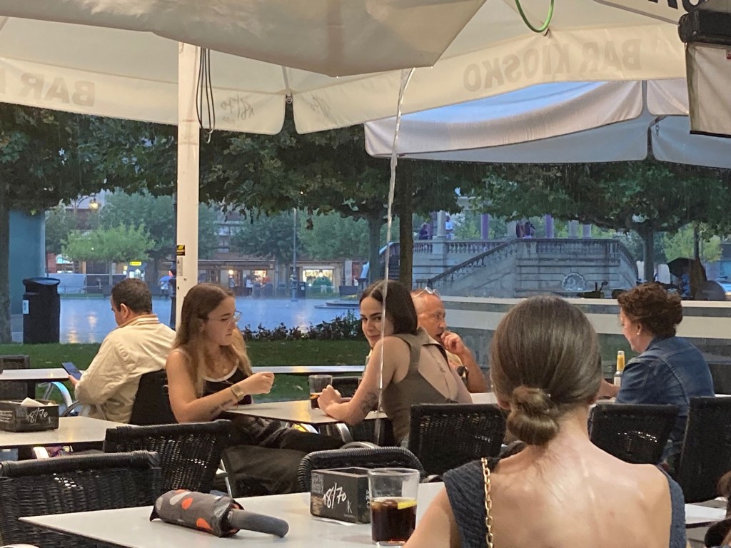 However like everyday , I need to fill you in on our evening in Pamplona . We decided to return to the bar where we had enjoyed our beer on arrival ..actually we didn’t have much choice as it was the only one open early enough for us to eat! So we enjoyed our meal at a table tucked at the back of the terrace . Then the heavens opened …..