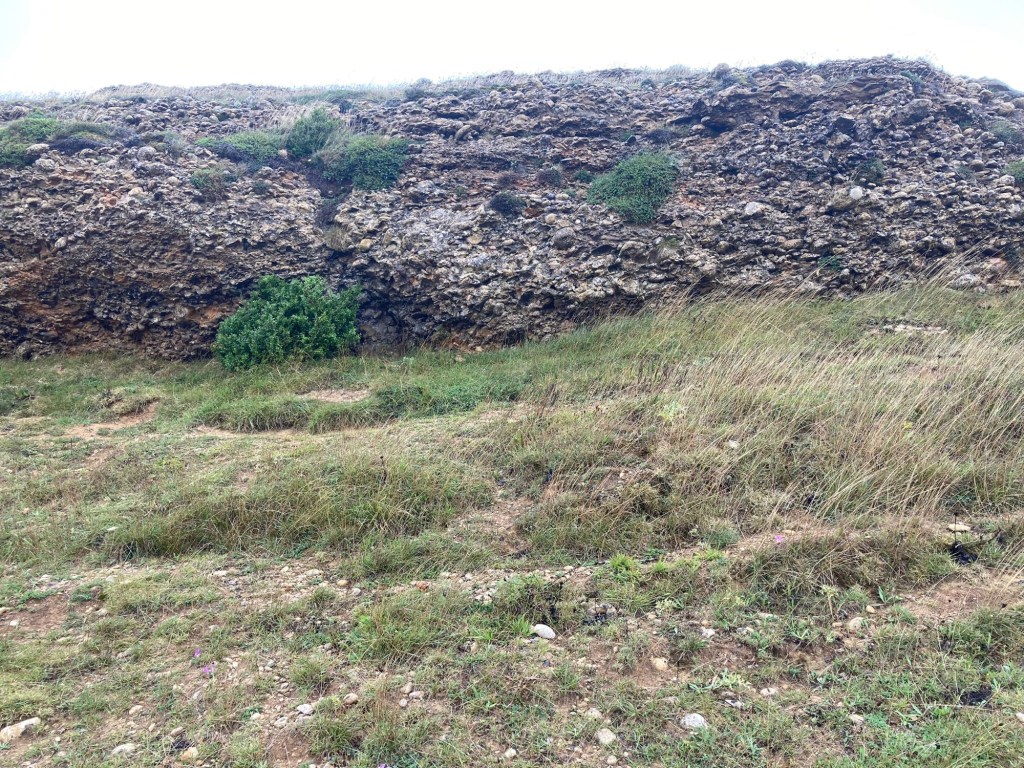 As we were reaching the ridge with the windmills, a cyclist who we had seen passing us on his way up, had clearly stopped and left his bicycle on the path . He then appeared from the top of a banking on our left . Looking up we saw ….