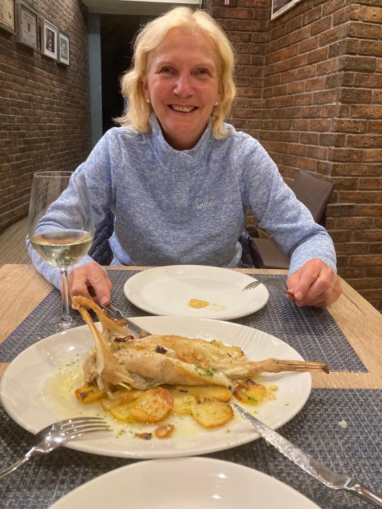 Sometimes our specialist advisors can let us down of course . For example, my gourmet Spanish food expert got things a little wrong last evening . Despite having the menu in English some words remain in Spanish , one of which was “ gorrin”. I had no idea what this was, so consulted my advisor who informed me it was a bird , and a small one at that! Interesting I thought …the menu offered roast palatilla ( shoulder) of gorrin , and also head of gorrin …not sure I’m enthused by a head of anything , but certainly not that of a small bird 🙄🙄😂😂Now you’re wondering what “ gorrin” is aren’t you …well, we found out eventually, because our Italian foodie pilgrim had ordered the shoulder version . It was in fact pork ! Please don’t ask about the head , thank you 🙏