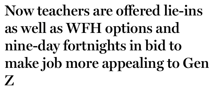 No one said teaching is an easy job …I am full of admiration for the teachers of our children , I think they have a tough time of it…..but when you enter that profession you know what you’re going into . Like nursing, medicine …the list goes on – are we going to try and attract Gen Z into those professions by offering WFH, lie ins and nine day fortnights . If we are, can I just point out there will be an issue with the morning drug round/ bed baths/surgery if the nurse/doctor is having a lie in 🙄