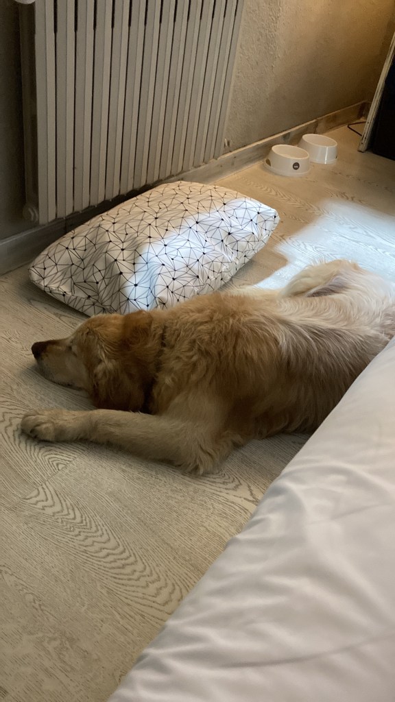 So it was again …another traumatic experience but this time in Spain…when I took Millie for her Rabies vaccination . We walked into the waiting room and who should be there but another Golden Retriever. Now I’ve always found there is a camaraderie between us Golden Retriever parents .. but this “Dad” was very tight lipped . I asked his dog’s age …14 – he was a lovely dog and you could see him watching the receptionist , a rustle of paper …ha, food potential. Millie was panting so I got out her water and gave her some …..” would your dog like some I ask” ( all in Spanish of course) “ no” came the reply. So we sat ….and then a terrible thought crossed my mind ….suddenly replaced when a woman entered with a large “ Labrador” type dog who was clearly very very ill.Before I had time to register any more, the old Golden Retriever is called through, and I was left with this extremely sick dog and owner ( grandma it turned out to be) …and Millie of course! The young owner turned up and this dog lay on her with a look of complete despair in her eyes…Time went on , and I was sure this dog was going to die in front of me ….I realised the Golden Retriever was a long time in consultation- if I’d been able to change Millie’s vaccination date I would have and we would have left ……and then to my horror but not surprise, the Golden Retrievers “Dad” appeared with the lead and collar and I knew what I’d been dreading all along.